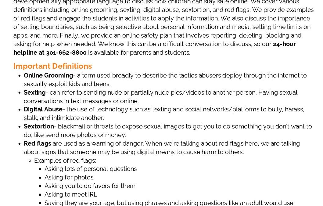 Please keep in mind that internet usage can be tracked and monitored. If you suspect you are being monitored online, please exit this site, delete your browser history, and call our hotline at 301-662-8800.